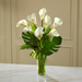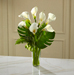 Elegant, dramatic, understated and sophisticated. This simple bouquet of white calla lilies is bound to make a big impact celebrating a very special life. When it’s time to pay tribute to someone who’s left behind memories of a big life well-lived, this arrangement does so, and with a rare eloquence. The sleek, sculptural white calla lilies open against a background of sword fern fronds and other greens arranged in a clear glass French vase. Appropriate for a wake, funeral service or to console grieving family or friends at home.