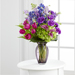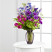 The FTD® Always Remembered™ Bouquet is a colorful symbol of a life that will never be forgotten. Purple tulips, blue delphinium, lavender mini calla lilies, purple carnations, lavender larkspur and green hydrangea are gorgeously arranged in a clear purple designer glass vase to create an emotional tribute that conveys your deepest sympathies.