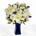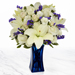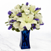 Our Beyond Blue Bouquet features lilies, roses, carnations and lush greens to captivate your recipient. A collection of brilliant white blooms is contrasted by a stunning and bold blue vase. This arrangement makes an excellent thank you, get well or engagement gift! For sharing your sympathies, this bouquet is best fit to send to a home or residence. Good – 14”h x 12”w Better – 16”h x 13”w Best – 17”h x 14”w