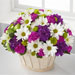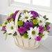 This pretty basket is sure to cheer up anyone's day. This white-wash handled basket is filled with green button pompons, white daisy pompons, hot pink mini carnations and purple carnations. A lavender ribbon bow completes your best wishes.