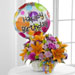 The FTD® Happy Blooms™ Basket brings together Asiatic lilies and carnations to create the perfect way to send your happy birthday wishes! Orange Asiatic lilies, lavender chrysanthemums, lavender carnations, purple monte casino asters, green button poms and lush greens are beautifully arranged within a rectangular whitewash willow handled basket accented with colorful curling ribbon. Arriving with a bright Mylar balloon exclaiming, "Happy Birthday," this flower arrangement will add to the celebration of their special day.