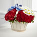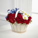 The FTD® Justice™ Basket is a perfect display of patriotic beauty. Red spray roses, carnations and miniature carnations are accented with a spray of white standard daisies presented in a whitewash basket gorgeously accented with a blue designer ribbon to create a floral arrangement that will do your heartfelt sentiment justice.