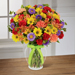 All the frills and every color under the sun, this fresh flower arrangement is ready to brighten your recipient's day! Yellow daisies, orange Peruvian Lilies, lavender matsumoto asters, orange carnations, and red mini carnations are accented with bupleurum and lush greens to create a fascinating display. Presented in a clear glass vase tied with a lime green ribbon at the neck, this flower bouquet is set to send your warmest wishes in celebration of their birthday, to express your thanks and gratitude, or to tell your recipient to get well soon! GOOD bouquet includes 8 stems. Approx. 12"H x 10"W. BETTER bouquet includes 13 stems. Approx. 13"H x 11"W. BEST bouquet includes 17 stems. Approx. 16"H x 14"W.