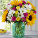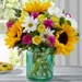 17-M8FTD® proudly presents the Better Homes and Gardens® Sunlit Meadows™ Bouquet. Blossoming with every color you are drawn to during spring's arrival, this gorgeous bouquet plays with cool and warm tones to draw you in and create that perfect way to touch your recipient's heart. Gorgeous sunflowers are the standout bloom in this arrangement offset by yellow spray roses, magenta mini carnations, white daisies, and bupleurum, all perfectly situated in a keepsake aqua glass vase to compliment and contrast with the flowers sunlit beauty. A wonderful Mother's Day, Easter, or happy birthday gift! GOOD bouquet includes 11 stems. Approx. 12"H x 12"W. BETTER bouquet includes 13 stems. Approx. 12"H x 13"W. BEST bouquet includes 18 stems. Approx. 13"H x 15"W.
