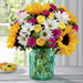 FTD® proudly presents the Better Homes and Gardens® Sunlit Meadows™ Bouquet. Blossoming with bright beauty and a color palette that exudes charm and cheer at every turn, this bouquet will be that perfect gift for any of life's special moments. Brilliant sunflowers are simply dazzling settled amongst yellow spray roses, magenta mini carnations, white traditional daisies, and lush greens to create a bouquet that has that "fresh from the garden" look. Presented in an aqua blue designer glass vase, this mixed flower bouquet will make an excellent birthday, thank you, or get well gift.