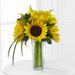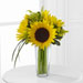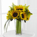 The FTD® Sunshine Daydream™ Bouquet highlights stunning sunflowers to capture their every attention with its bright beauty. Gorgeous sunflowers are accented with solidago, lily grass blades and lush greens to create a memorable flower bouquet. Presented in a clear glass tapered square vase, this arrangement sends your warmest wishes and highest hopes for the days ahead.