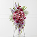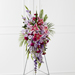 The FTD® Tender Touch™ Standing Spray creates an elegant display of beauty and color to enhance their final tribute. Lavender gladiolus, Stargazer lilies, fuchsia carnations, purple larkspur, lavender Peruvian lilies, lavender chrysanthemums, sword fern fronds, emerald palm fronds and other assorted greens are gorgeously arranged to create a sophisticated standing spray. Displayed on a wire easel, this arrangement will add to the sophistication of their service with each fragrant bloom.